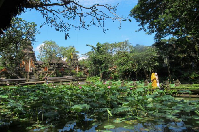 蓮の池に、バリ島らしい寺院、ウブドらしい一枚が撮影できるスポット。沢山の人がカメラに熱中。