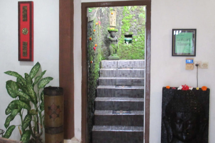 ウブド王宮から王宮を背にして、モンキーフォレスト通りへ向かうオーガニックコスメ「センシア」から200m程過ぎた所にある、細い道を右に曲がり50m程坂を下った左側