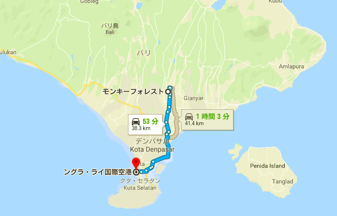 デンパサール国際空港、クタエリアから、車やバスでおよそ1.5時間。