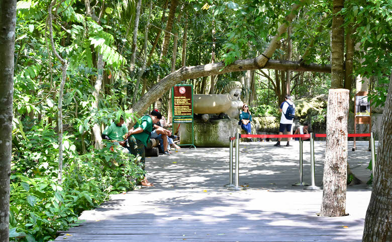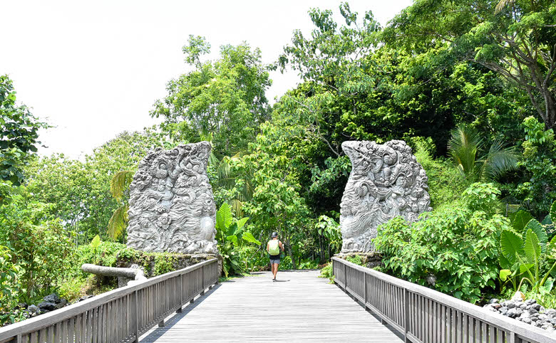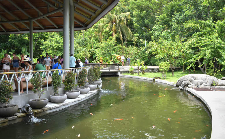 モンキーフォレストの森が奥にあり、鯉が泳ぐ池。コモドトカゲの彫刻。他にも色々記念撮影スポットあり。